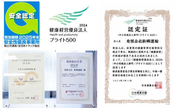 家族のような社員の健康や安全を守るためにという数々の取り組みは、全日本トラック協会の「安全性優良事業所(Gマーク)」をはじめ、ドライバーの働き方改革に取り組む 「ホワイト物流推進運動」への登録など、社内のみならず外部からの高い評価も得ており、2019年から6年連続で健康経営優良法人認定、2022年からは「ブライト500」*にも選出されています。
