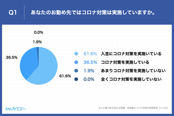 「Q1.あなたのお勤め先ではコロナ対策は実施していますか。」(n=104)と質問したところ「入念にコロナ対策を実施している」が61.6%、「コロナ対策を実施している」が36.5%という回答となりました。