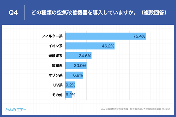 Q2で「空気改善機器による対策」と回答した方に「Q4.どの種類の空気改善機器を導入していますか。(複数回答)」(n=65)と質問したところ、「フィルター系」が75.4%、「イオン系」が46.2%、「光触媒系」が24.6%という回答となりました。
