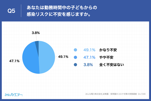 「Q5.あなたは勤務時間中の子どもからの感染リスクに不安を感じますか。」(n=104)と質問したところ、「かなり不安」が49.1%、「やや不安」が47.1%という回答となりました。