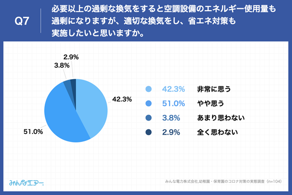「Q7.必要以上の過剰な換気をすると空調設備のエネルギー使用量も過剰になりますが、適切な換気をし、省エネ対策も実施したいと思いますか。」(n=104)と質問したところ、「非常に思う」が42.3%、「やや思う」が51.0%という回答になりました。