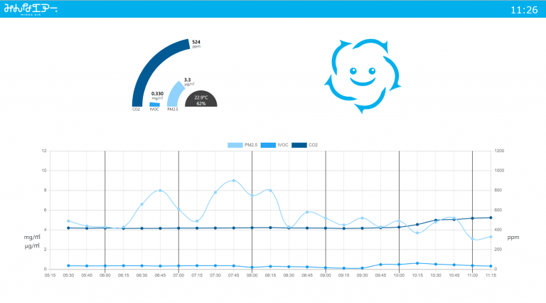 ・設置機器③:空気のDXサービス「MADO(マド)」より、空気質計測デバイス5台設置予定 空間のCO2やpm2.5、揮発性ガスなどを計測し、クラウドへ送信。PCやタブレットなどのデバイス・サイネージにて空気環境を可視化します。