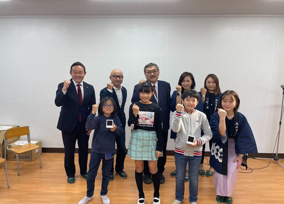 <実証実験に向け意気込む関係者_左後ろから元沢氏、大石、佐川校長、UPDATER社員、前列左から平間小学校生徒3名、UPDATER社員>