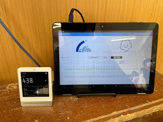 <平間小学校の教室に設置された空気質計測器「MADO」>