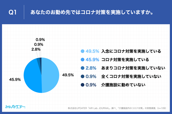 「顔の見えるライフスタイル」の実現を目指す株式会社UPDATER(10月1日みんな電力株式会社より社名変更、所在地:東京都世田谷区、代表取締役:大石英司)のエアテック事業「みんなエアー」(https://minnaair.com/)は、介護施設従事者109名を対象に、「介護施設内のコロナ対策」の実態調査を実施しました。