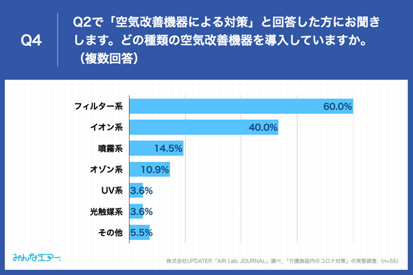 「Q4.Q2で「空気改善機器による対策」と回答した方にお聞きします。どの種類の空気改善機器を導入していますか。(複数回答)」(n=55)と質問したところ、「フィルター系」が60.0%、「イオン系」が40.0%、「噴霧系」が14.5%という回答となりました。