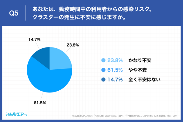 「Q5.あなたは、勤務時間中の利用者からの感染リスク、クラスターの発生に不安に感じますか。」(n=109)と質問したところ、「かなり不安」が23.8%、「やや不安」が61.5%という回答となりました。
