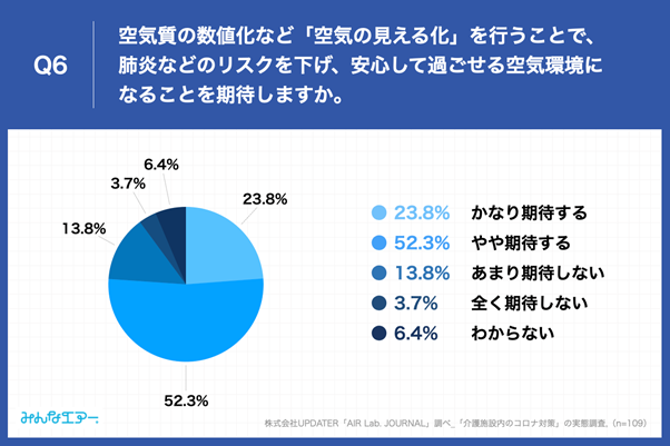 「Q6.空気質の数値化など「空気の見える化」を行うことで、肺炎などのリスクを下げ、安心して過ごせる空気環境になることを期待しますか。」(n=109)と質問したところ、「かなり期待する」が23.8%、「やや期待する」が52.3%という回答となりました。