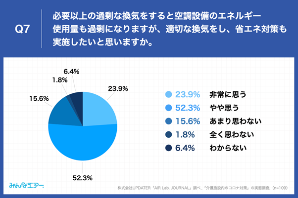 「Q7.必要以上の過剰な換気をすると空調設備のエネルギー使用量も過剰になりますが、適切な換気をし、省エネ対策も実施したいと思いますか。」(n=109)と質問したところ、「非常に思う」が23.9%、「やや思う」が52.3%という回答となりました。