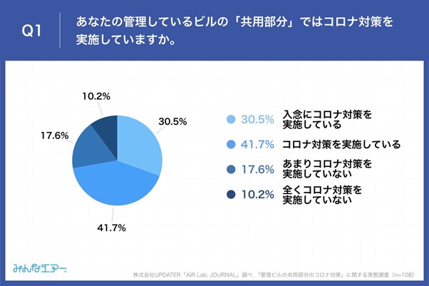「顔の見えるライフスタイル」の実現を目指す株式会社UPDATER(所在地:東京都世田谷区、代表取締役:大石英司)のエアテック事業「みんなエアー」(https://minnaair.com/)は、ビル管理者108名を対象に、「管理ビルの共用部分のコロナ対策」に関する実態調査を実施しました。