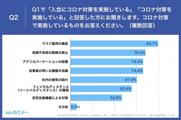 Q1で「入念にコロナ対策を実施している」「コロナ対策を実施している」と回答した方に、「Q2.コロナ対策で実施しているものをお答えください。(複数回答)」(n=78)と質問したところ、「マスク着用の徹底」が89.7%、「体調不良時の勤務の禁止」が76.9%、「アクリルパーテーションの設置」が74.4%という回答となりました。