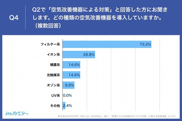 Q2で「空気改善機器による対策」と回答した方に、「Q4.どの種類の空気改善機器を導入していますか。(複数回答)」(n=41)と質問したところ、「フィルター系」が73.2%、「イオン系」が26.8%、「噴霧系」「光触媒系」が14.6%という回答となりました。