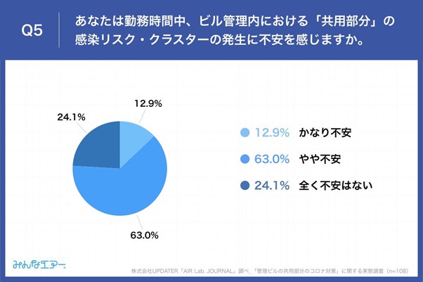 「Q5.あなたは勤務時間中、管理ビル内における「共用部分」の感染リスク・クラスターの発生に不安を感じますか。」(n=108)と質問したところ、「かなり不安」が12.9%、「やや不安」が63.0%という回答となりました。
