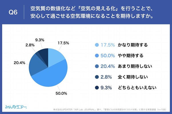 「Q6.空気質の数値化など「空気の見える化」を行うことで、安心して過ごせる空気環境になることを期待しますか。」(n=108)と質問したところ、「かなり期待する」が17.5%、「やや期待する」が50.0%という回答となりました。