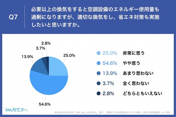 「Q7.必要以上の換気をすると空調設備のエネルギー使用量も過剰になりますが、適切な換気をし、省エネ対策も実施したいと思いますか。」(n=108)と質問したところ、「非常に思う」が25.0%、「やや思う」が54.6%という回答となりました。