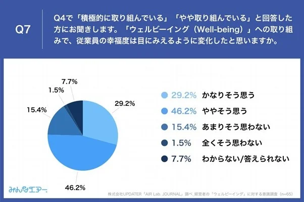 Q4で「積極的に取り組んでいる」「やや取り組んでいる」と回答した方に、「Q7.「ウェルビーイング(Well-being)」への取り組みで、従業員の幸福度は目にみえるように変化したと思いますか。」(n=65)と質問したところ、「ややそう思う」が46.2%、「かなりそう思う」が29.2%という回答となりました。