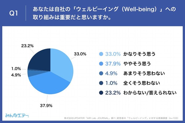 「Q1.あなたは自社の「ウェルビーイング(Well-being)」への取り組みは重要だと思いますか。」(n=103)と質問したところ、「かなりそう思う」が33.0%、「ややそう思う」が37.9%という回答となりました。
