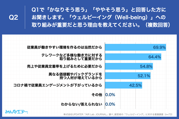 Q1で「かなりそう思う」「ややそう思う」と回答した方に、「Q2.「ウェルビーイング(Well-being)」への取り組みが重要だと思う理由を教えてください。(複数回答)」(n=73)と質問したところ、「従業員が働きやすい環境を作るのは当然だから」が69.9%、「テレワークなど多様な働き方に対する取り組みとして重要だから」が64.4%という回答となりました。