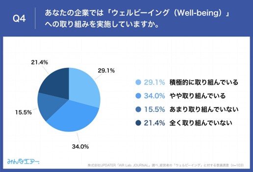 「Q4.あなたの企業では「ウェルビーイング(Well-being)」への取り組みを実施していますか。」(n=103)と質問したところ、「積極的に取り組んでいる」が29.1%、「やや取り組んでいる」が34.0%という回答となりました。