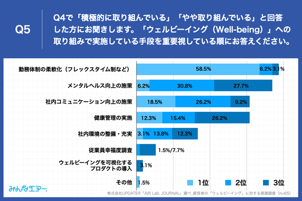 Q4で「積極的に取り組んでいる」「やや取り組んでいる」と回答した方に、「Q5.「ウェルビーイング(Well-being)」への取り組みで実施している手段を重要視している順にお答えください。(8項目ランキング回答)」(n=65)と質問したところ、上位は、「勤務体制の柔軟化(フレックスタイム制など)」が67.8%、「メンタルヘルス向上の施策」が64.7%、「社内コミュニケーション向上の施策」・「健康管理の実施」が53.9%という回答となりました。
