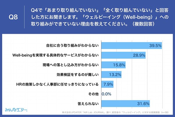 Q4で「あまり取り組んでいない」「全く取り組んでいない」と回答した方に、「Q8.「ウェルビーイング(Well-being)」への取り組みができていない理由を教えてください。(複数回答)」(n=38)と質問したところ、「自社に合う取り組みがわからない」が39.5%、「ウェルビーイング(Well-being)を実現する具体的なサービスがわからない」が28.9%という回答となりました。