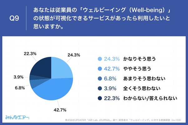 「Q9.あなたは従業員の「ウェルビーイング(Well-being)」の状態が可視化できるサービスがあったら利用したいと思いますか。」(n=103)と質問したところ、「かなりそう思う」が24.3%、「ややそう思う」が42.7%という回答となりました。