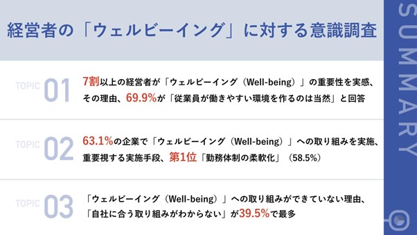 まず、7割以上の経営者が、「ウェルビーイング(Well-being)」の重要性を実感しており、「ウェルビーイング(Well-being)」への取り組み理由として、69.9%が「従業員が働きやすい環境を作るのは当然だから」と回答しました。他にも、「良い人材の確保のため」や「生産性の向上にも貢献すると思う」などの理由も挙がりました。