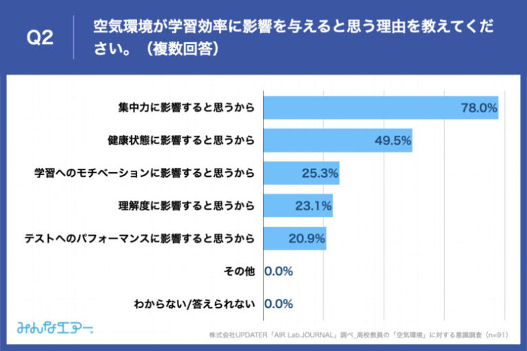 Q1で「非常にそう思う」「ややそう思う」と回答した方に、「Q2.空気環境が学習効率に影響を与えると思う理由を教えてください。(複数回答)」(n=91)と質問したところ、「集中力に影響すると思うから」が78.0%、「健康状態に影響すると思うから」が49.5%、「学習へのモチベーションに影響すると思うから」が25.3%という回答となりました。