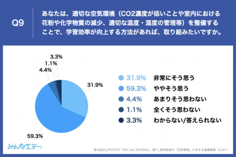 Q1で「非常にそう思う」「ややそう思う」と回答した方に、「Q9.あなたは、適切な空気環境(CO2濃度が低いことや室内における花粉や化学物質の減少、適切な温度・湿度の管理等)を整備することで、学習効率が向上する方法があれば、取り組みたいですか。」(n=91)と質問したところ、「非常にそう思う」が31.9%、「ややそう思う」が59.3%という回答となりました。