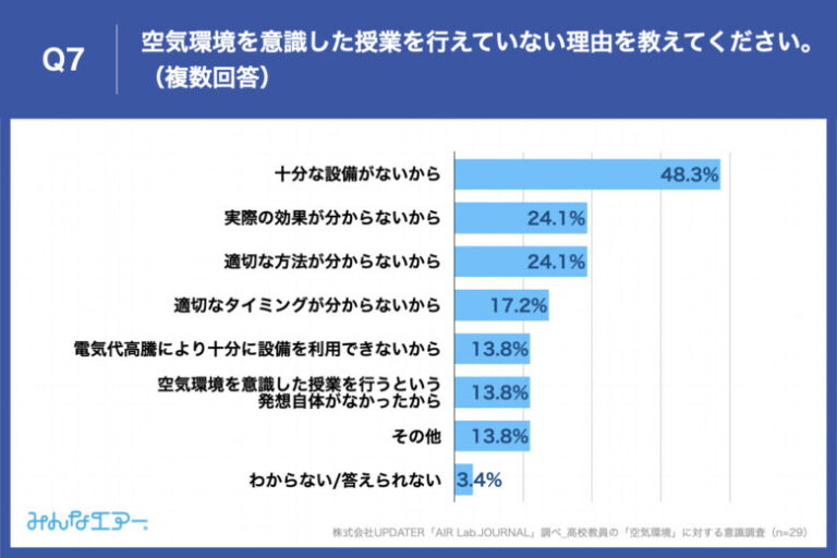 Q4で「あまりそう思わない」「全くそう思わない」と回答した方に、「Q7.空気環境を意識した授業を行えていない理由を教えてください。(複数回答)」(n=29)と質問したところ、「十分な設備がないから」が48.3%、「実際の効果が分からないから」が24.1%、「適切な方法が分からないから」が24.1%という回答となりました。