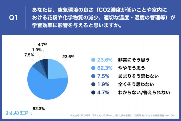 「Q1.あなたは、空気環境の良さ(CO2濃度が低いことや室内における花粉や化学物質の減少、適切な温度・湿度の管理等)が学習効率に影響を与えると思いますか。」(n=106)と質問したところ、「非常にそう思う」が23.6%、「ややそう思う」が62.3%という回答となりました。