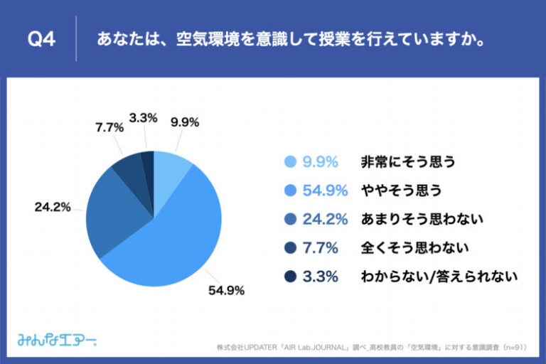 Q1で「非常にそう思う」「ややそう思う」と回答した方に、「Q4.あなたは、空気環境を意識して授業を行えていますか。」(n=91)と質問したところ、「あまりそう思わない」が24.2%、「全くそう思わない」が7.7%という回答となりました。