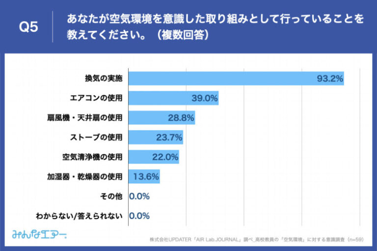 Q4で「非常にそう思う」「ややそう思う」と回答した方に、「Q5.あなたが空気環境を意識した取り組みとして行っていることを教えてください。(複数回答)」(n=59)と質問したところ、「換気の実施」が93.2%、「エアコンの使用」が39.0%、「扇風機・天井扇の使用」が28.8%という回答となりました。