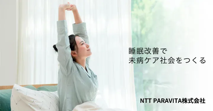 NTT PARAVITA株式会社では、2021年設立後、睡眠センサーから「睡眠データ」を解析し、未病早期発見の支援や健康促進のための情報提供を目的としたヘルスケア事業を展開しています。ウェルビーイングの観点からは、健康経営のための睡眠改善サービスを提供し、従業員の生産性向上と健康増進をサポートしています。