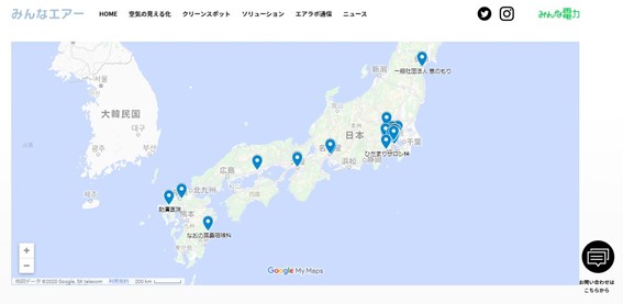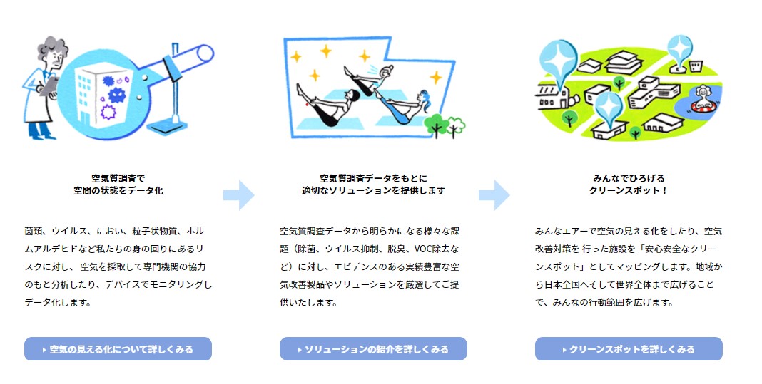 現在、「みんなエアー」は空気環境対策事業として、空気質調査と調査結果に基づく効率的な改善策の提供、改善対策を実施する施設を公開するマッピングサービスを行っています。