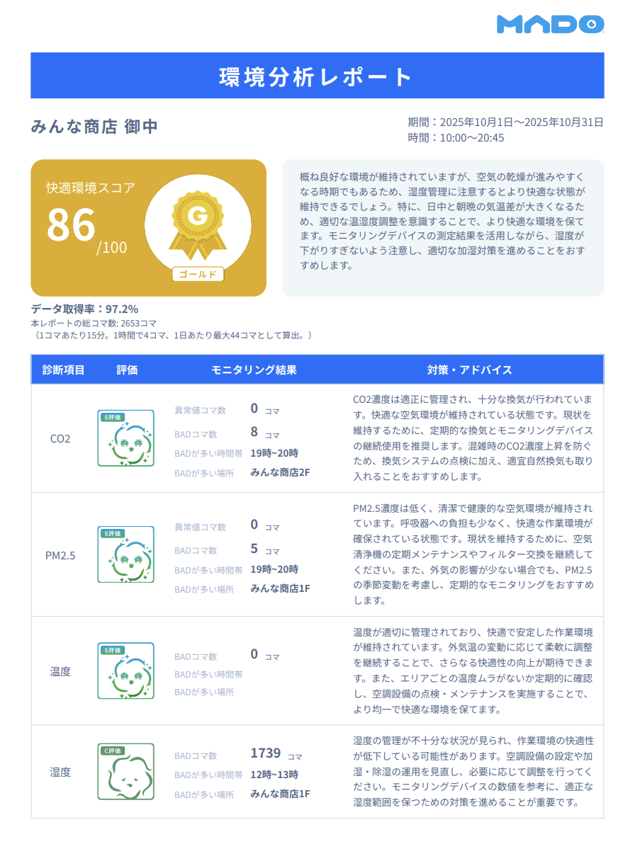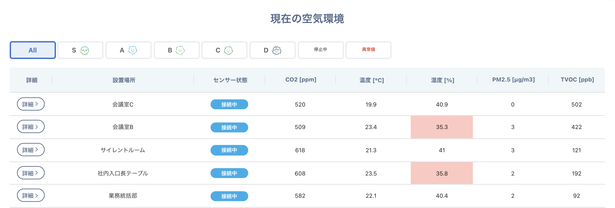 ・閾値を超えた項目は色付きで表示され、どの設置場所・どの項目に課題があるか一目で把握できます。